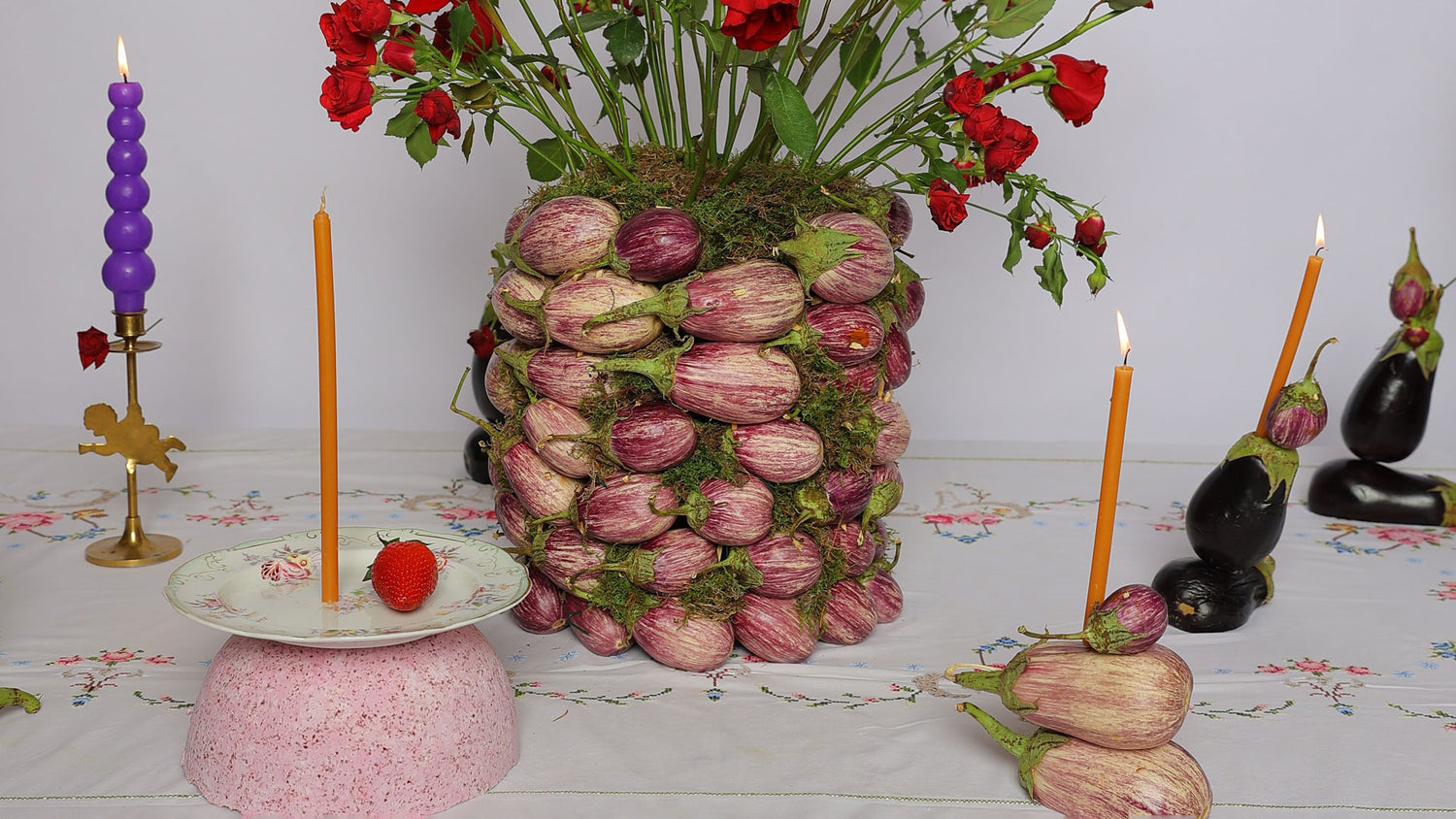Behold my signature vases, crafted from real eggplants, cradling vibrant roses atop...