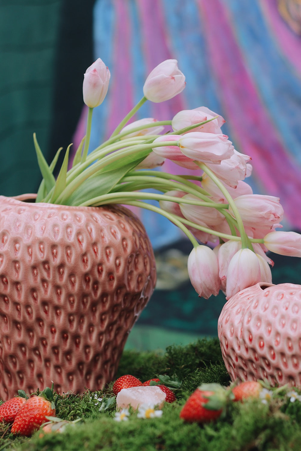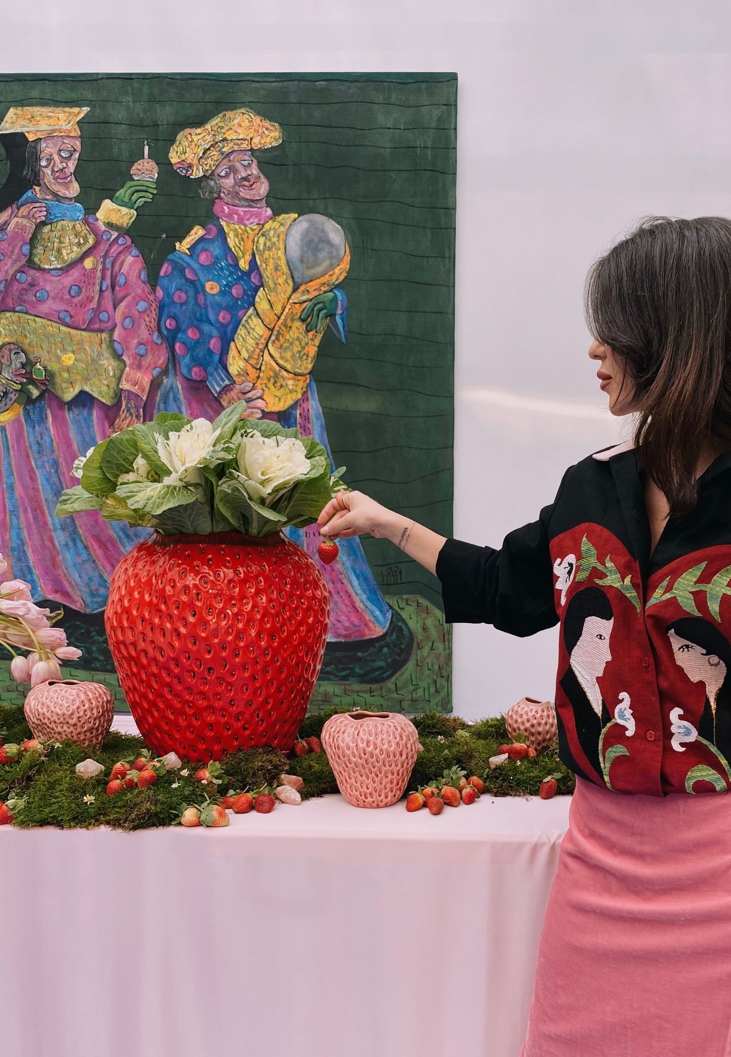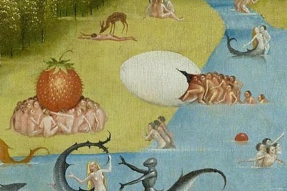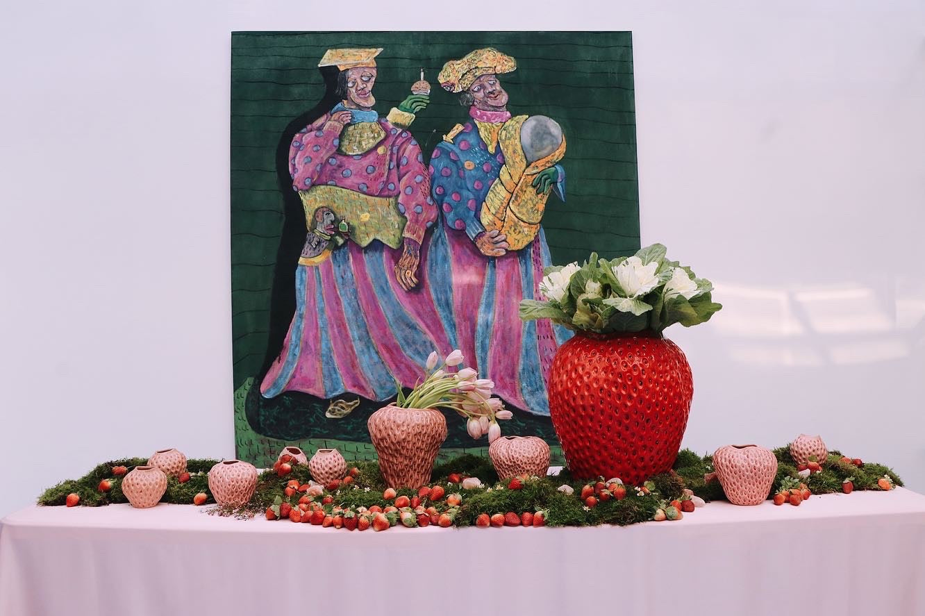 Taking inspiration from Hieronymus Bosch's painting "The Garden of Earthly Delights" The scattered strawberries in the painting are a symbol of “death concealed beneath a smiling appearance.” Let’s remind ourselves that kindness goes a long way.
