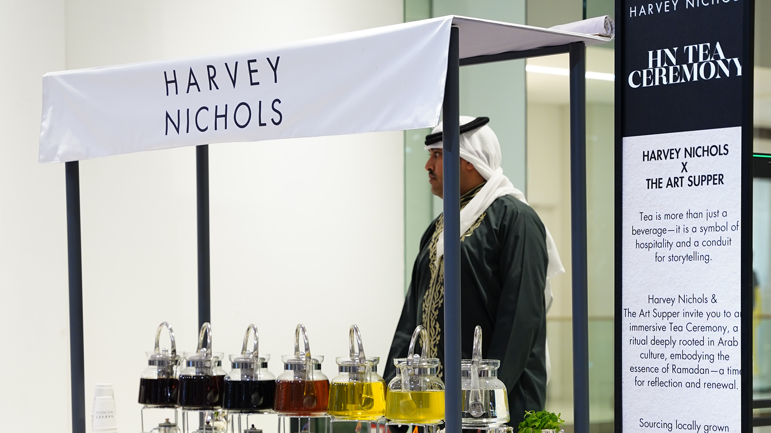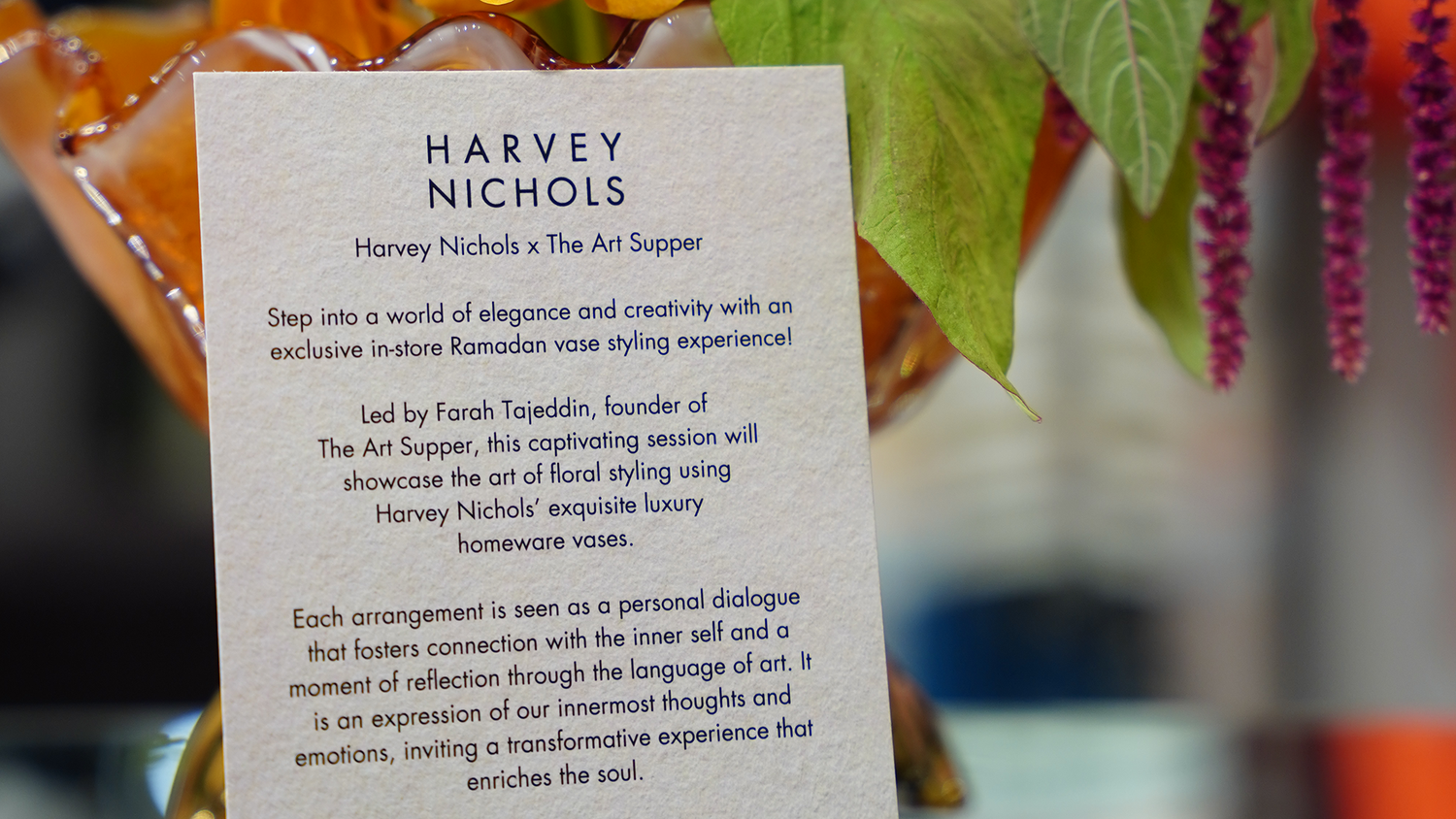 In collaboration with Harvey Nichols, The Art Supper unveiled a tea ceremony & bespoke mirror pillar installation that captured the introspective spirit of Ramadan through light, depth, and beauty. Styled by Farah Tajeddin, sculptural floral arrangements atop mirrored pillars transformed the space into a contemplative art piece.