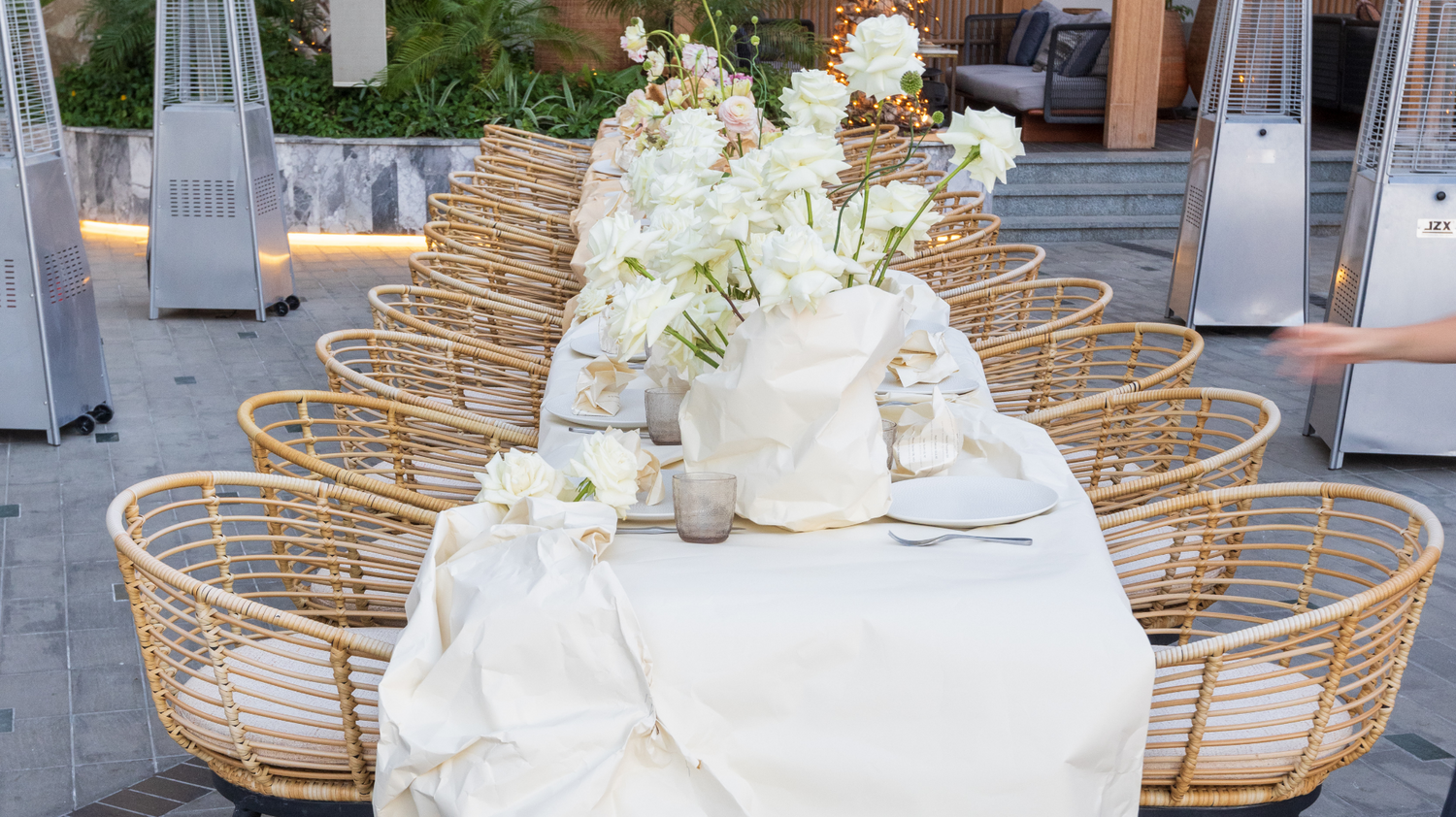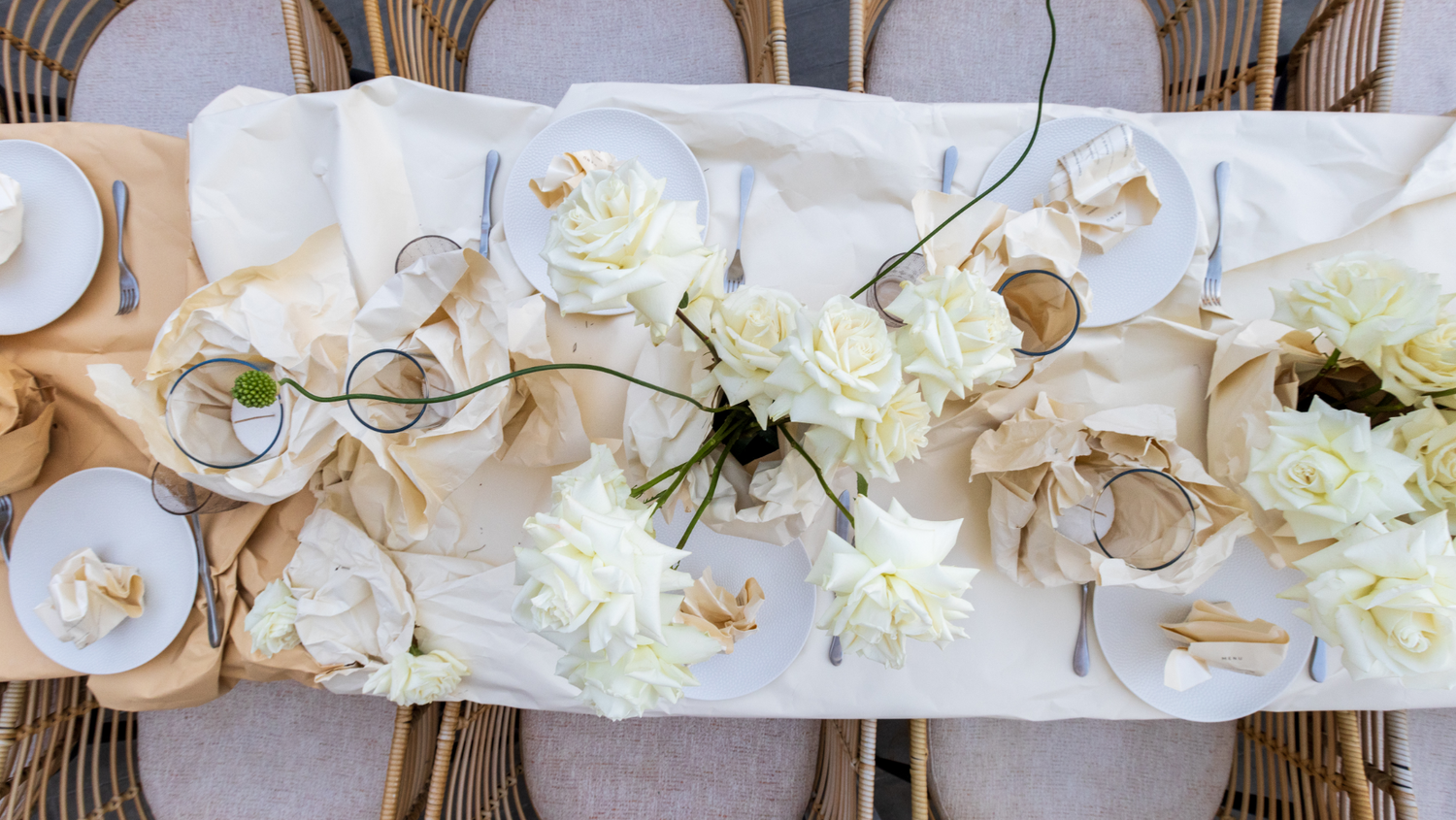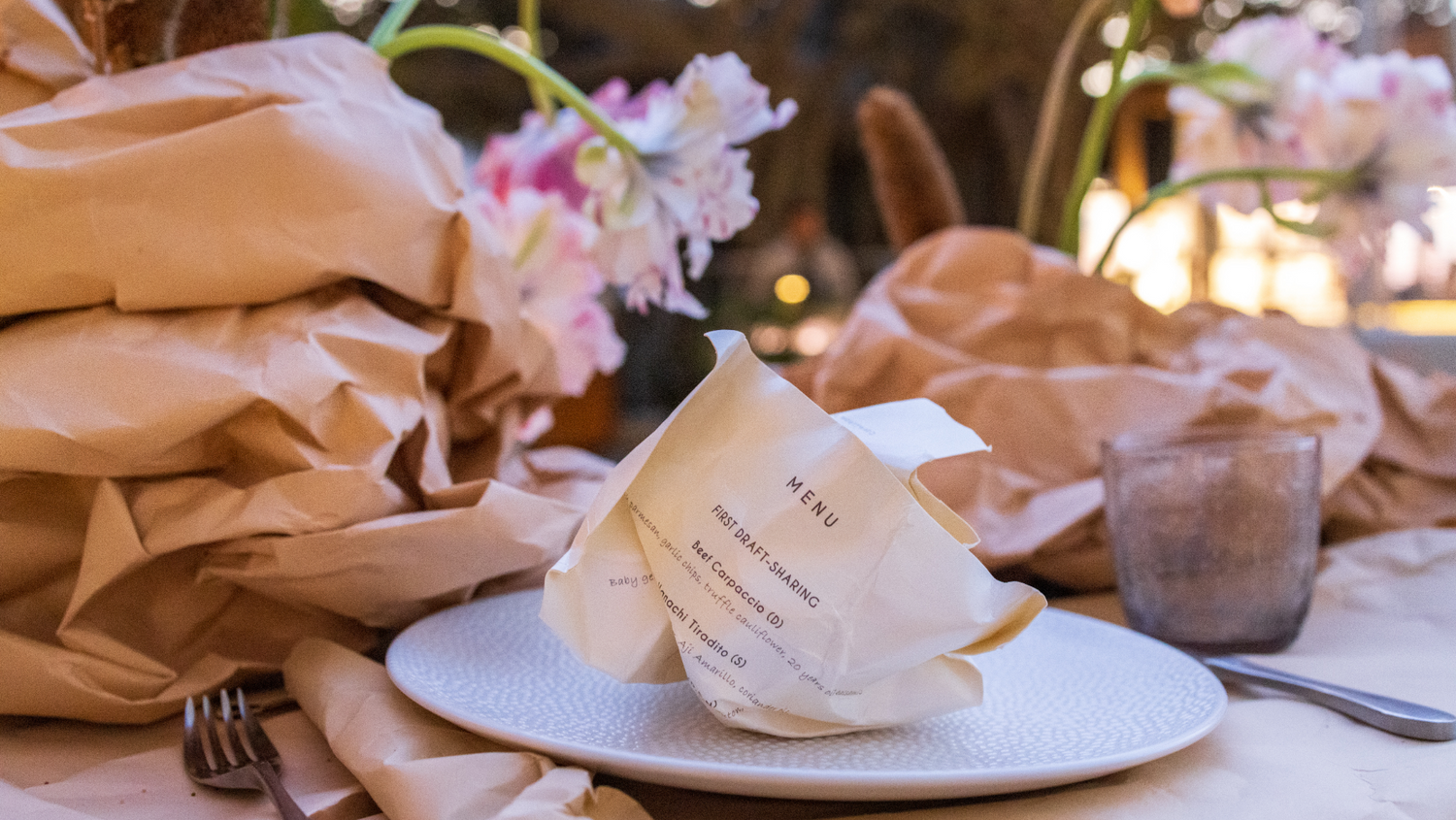 flowers in hues that are beautifully synchronized. The crumpled menu radiates chic