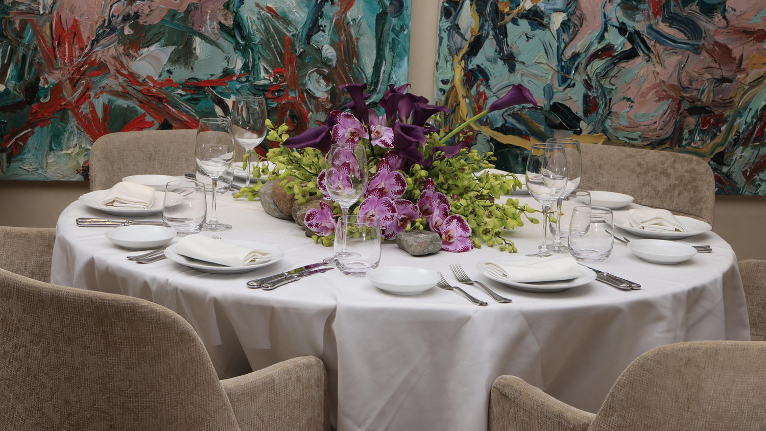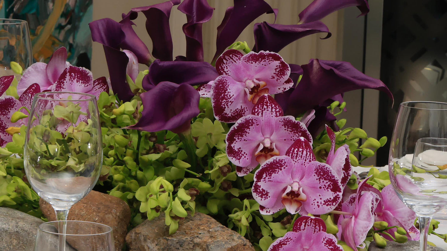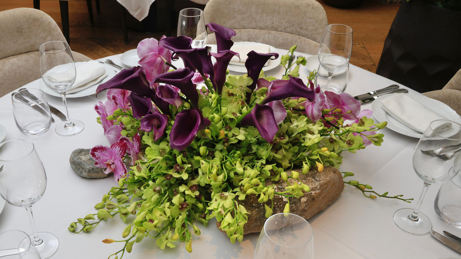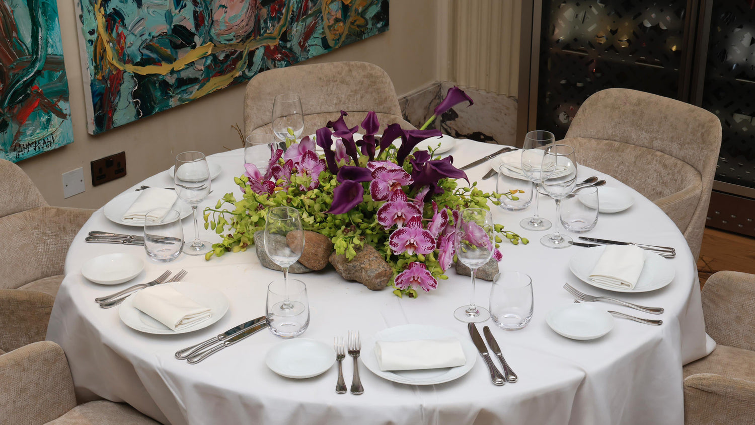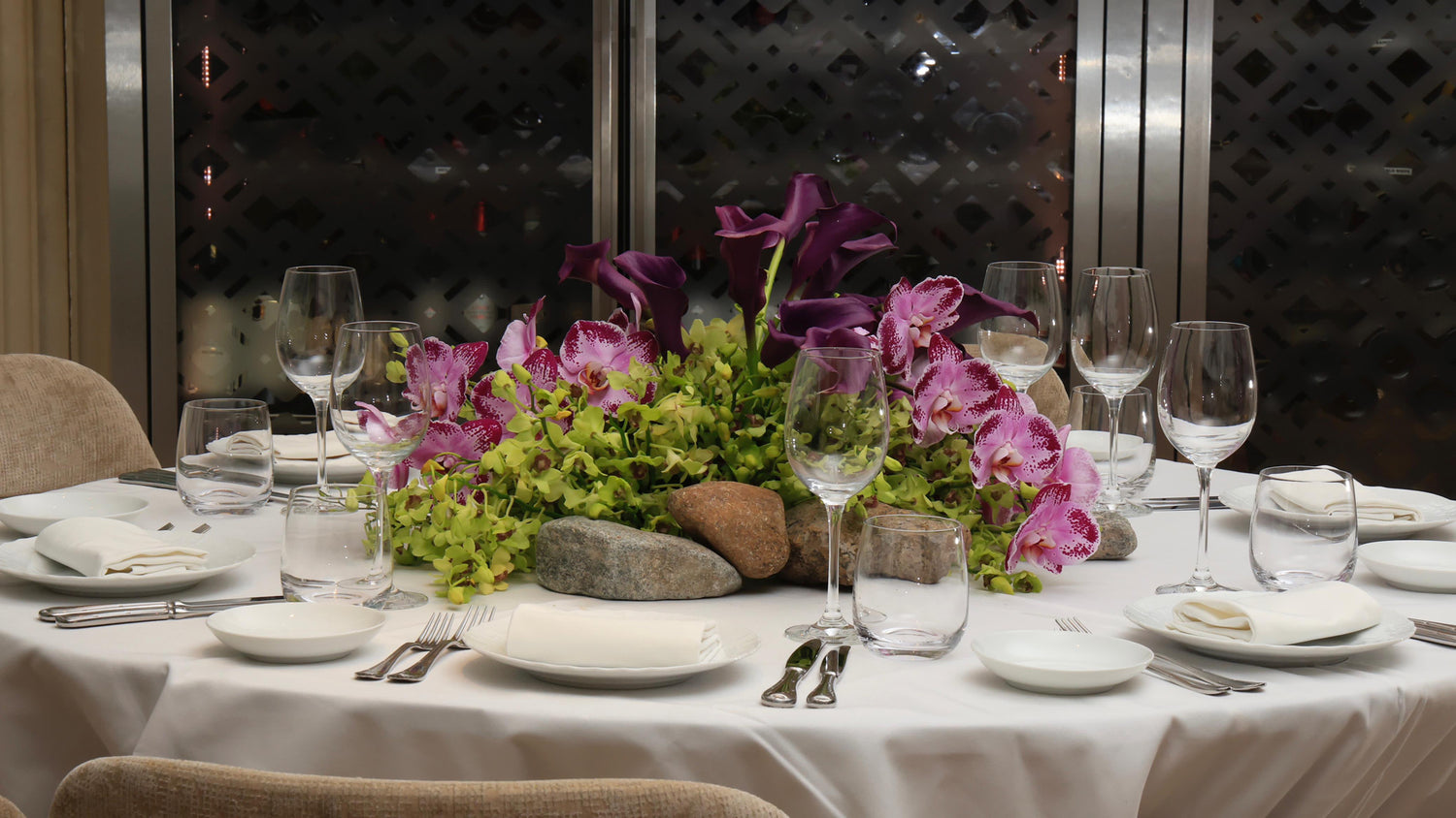 Designed for The World Economic Forum dinner produced by Time Entertainment, this tablescape is curated by The Art Supper which is inspired by Saudi Arabia's royal heritage. The purple Vanda orchids in our design symbolize respect and wealth, adding a luxurious and regal touch that reflects Saudi Arabia's rich cultural heritage and global influence. Additionally, the inclusion of calla lilies symbolizes wisdom and awakening, reflecting Saudi Arabia's vibrant society where various passions thrive, inviting the world to discover its richness and diversity. Together, these flowers, with their symbolic meanings and aesthetic appeal, embody Saudi Arabia's rich heritage and promising future.